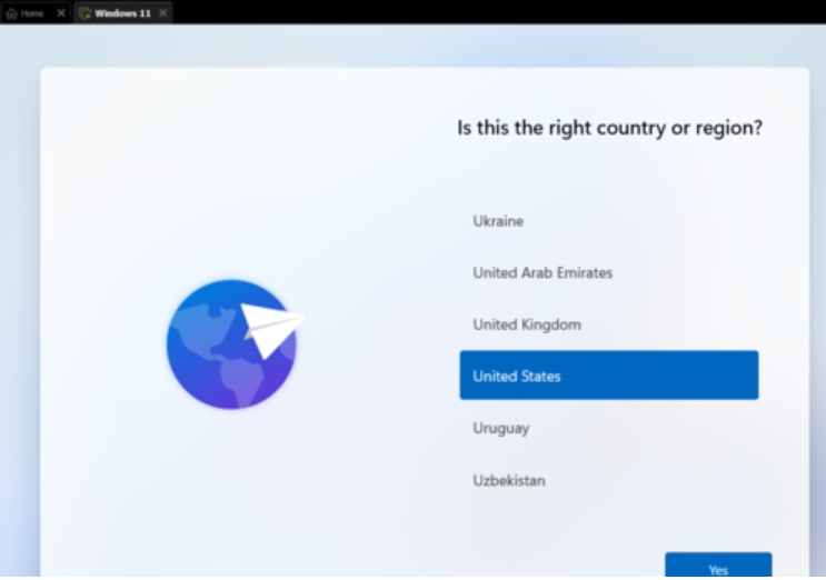 5、根據提示設置國家和語言,目前支持的國家和語言比較少,我們可以選擇英語。然后點擊“Yes”