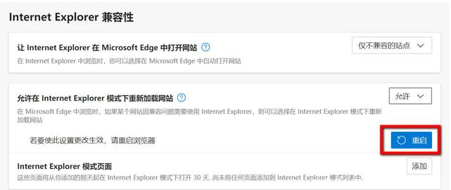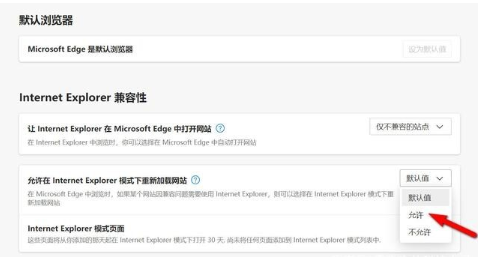 3、將【允許在Internet Explorer模式下重新加載網站】選擇為【允許】;