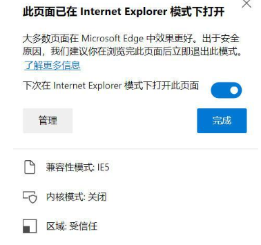 6、加載完成后會出現如下提示,點擊完成就可以使用IE兼容模式瀏覽頁面了。