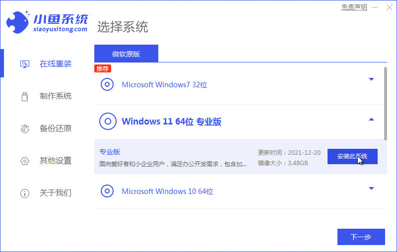 1、首先,上網下載小魚系統軟件,打開后選擇在線重裝,找到要安裝的系統版本后,點擊下一步。