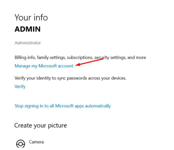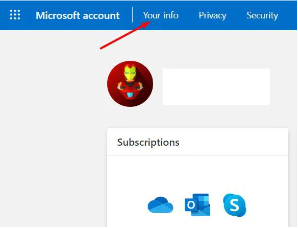 2、點擊“Your info”,再點擊“Manage my Microsoft account”。