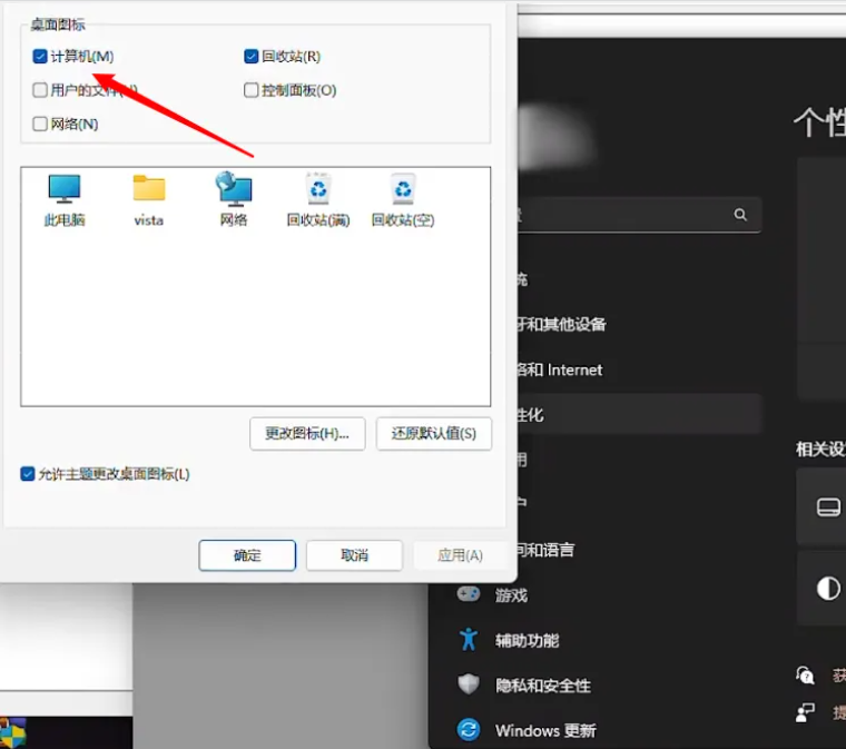 4、在桌面圖標一欄中勾選計算機選項,點擊確定就行了。