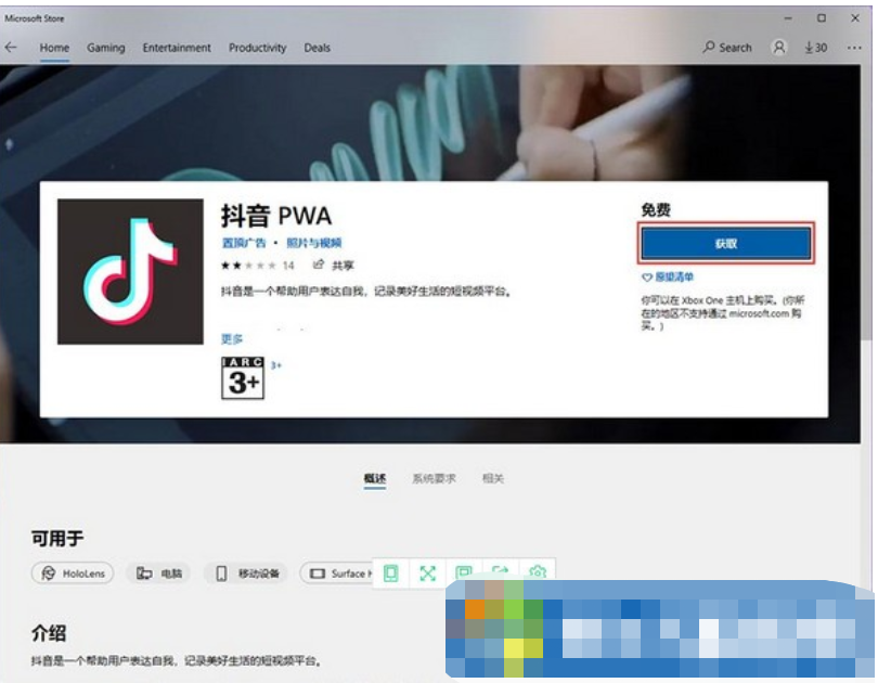 4、在抖音打開頁面中,點擊右上角的獲取。
