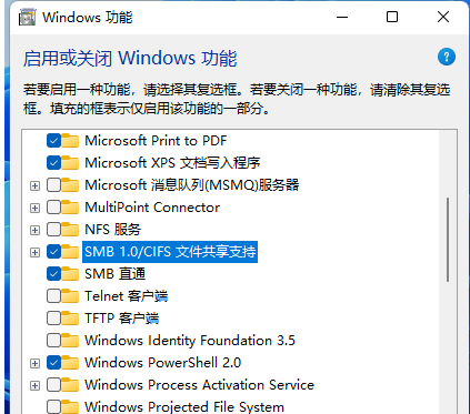 4、Windows 功能,啟用或關閉 Windows 功能,若要啟用一種功能,請選擇其復選框。若要關閉一種功能,請清除其復選框。填充的框表示僅啟用該功能的一部分,找到并勾選SMB 1.0/CIFS文件共享支持,這時候我們只需要耐心等待該功能完成安裝即可;