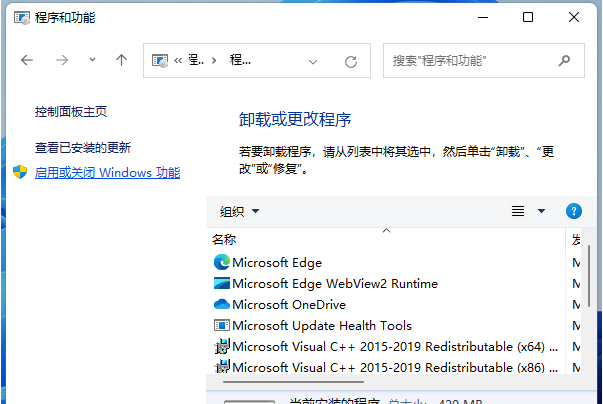 3、程序和功能窗口,左側邊欄,點擊啟用或關閉 Windows 功能;