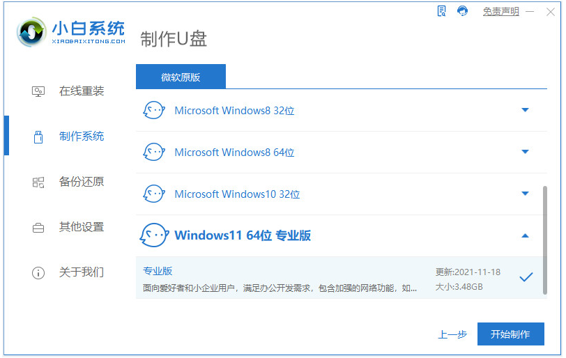 2、選擇需要的win11系統,點擊開始制作u盤啟動盤。
