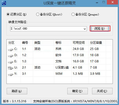 2、進入win8pe系統,將會自行彈出安裝工具,點擊“瀏覽”進行選擇存到u盤中win7系統鏡像文件,如下圖所示: