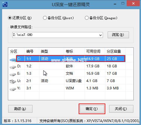 3、等待u深度pe裝機工具自動加載win7系統鏡像包安裝文件,只需選擇安裝磁盤位置,然后點擊“確定”按鈕即可,如下圖所示: