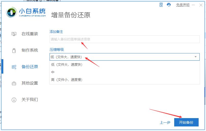 4、添加備注后,選擇一個比較合適的“壓縮等級”,一般默認不改。最后開始備份即可。
