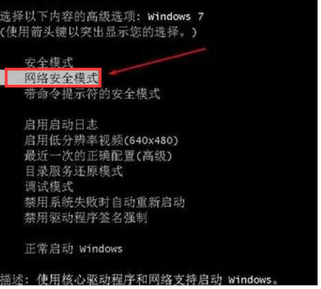 2.開機的時候按F8鍵(這時鍵盤肯定能用),然后到高級啟動選項下選擇”帶網絡的安全模式“。