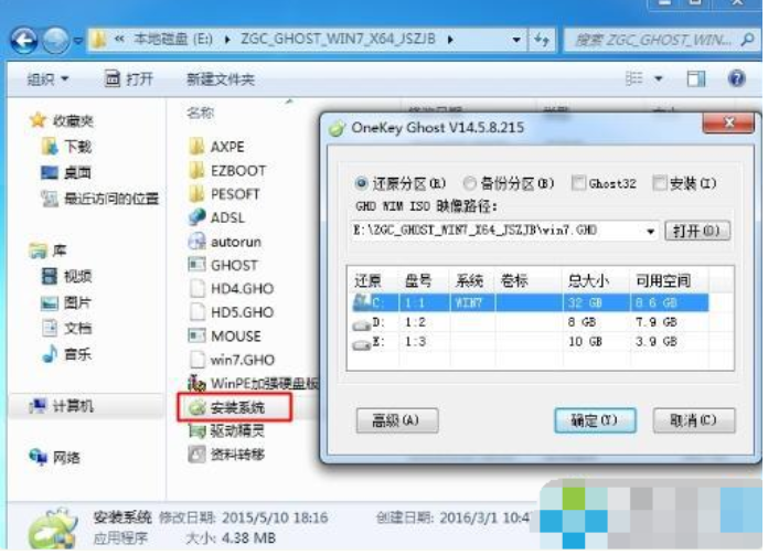 2、雙擊“安裝系統.exe”打開Onekey Ghost,選擇安裝位置C盤,確定;