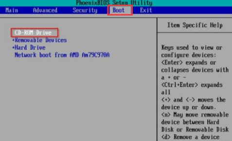 3.用方向鍵選擇boot在選擇CD-ROM Drive。