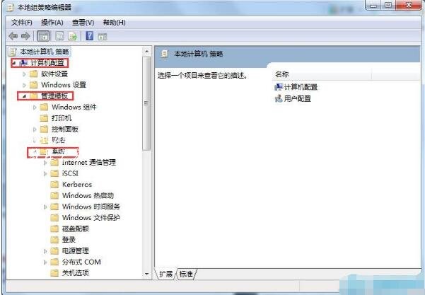 3、在打開的本地組策略編輯器中依次選擇展開“計算機配置”→“管理模板”→“系統”。