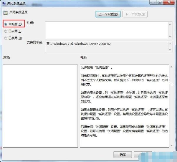 6、彈出的關閉系統還原屬性的對話框,然后點擊“未配置”,最后確認就可以了。