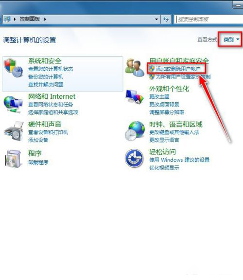 9、打開控制面板后,選類別,點擊添加或刪除用戶賬戶。