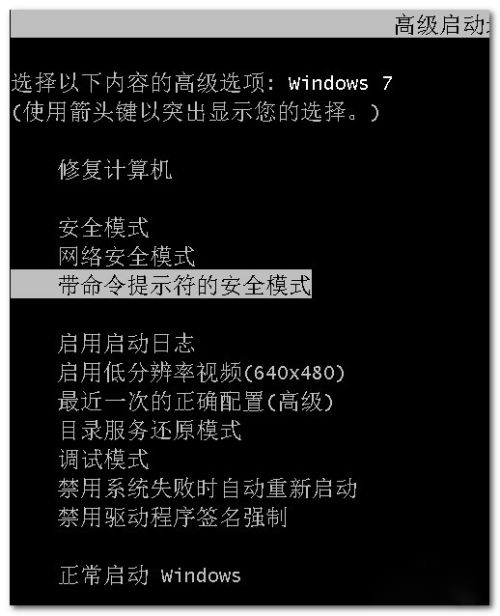 3、 在Windows 7系統啟動時按F8鍵會出現如圖選項,選帶命令提示符 安全模式