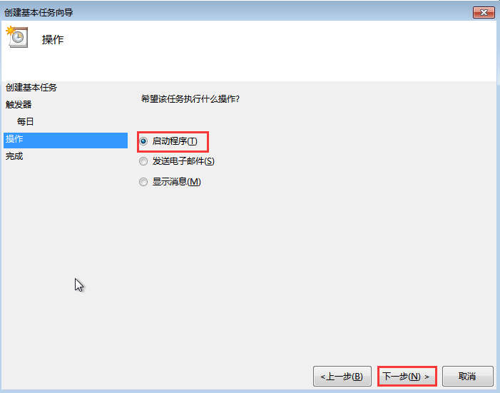 Step6:在“操作”的對話框中點擊“啟動程序——下一步”