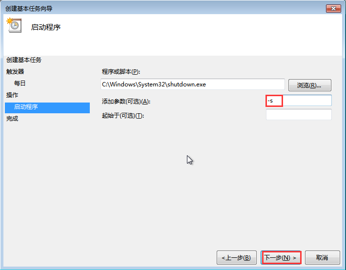 Step8:打開后在“添加參數(可選)(A)“輸入”-s“,點擊”下一步“