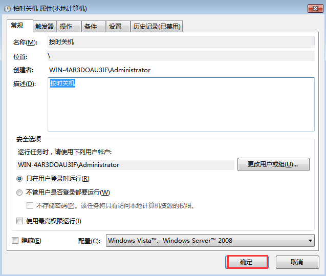 Step10:在彈出的“按時關機 屬性“對話框內點擊“確定“