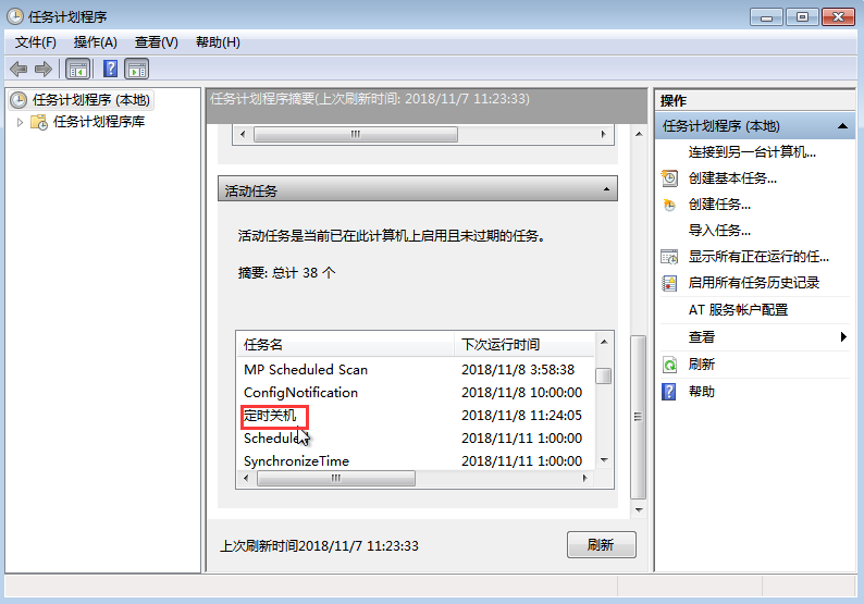 Step11:點擊“完成“后就成功設置定時關機了,在”任務計劃程序庫“中可以找到添加的任務,如果用戶想要進行運行、刪除等操作時,雙擊”定時關機“,在彈出窗口右側的”選項下方“可進行操作