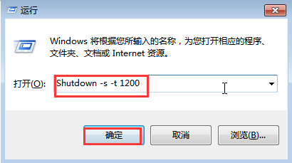 Step1:使用“Win+R“快捷鍵打開運行窗口,輸入”Shutdown –s –t 1200“,點擊”確定“(注意:”-s“和”-t“前面均有一個空格;數字”1200“代表的是20分鐘,即一分鐘按60秒換算)