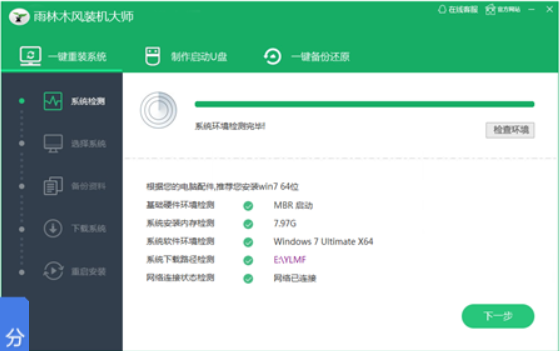 1、從官網上下載雨林木風裝機大師到電腦上,雙擊打開進入軟件首界面,點擊“我知道了”按鈕進入檢測頁面,完成后點擊“下一步”。