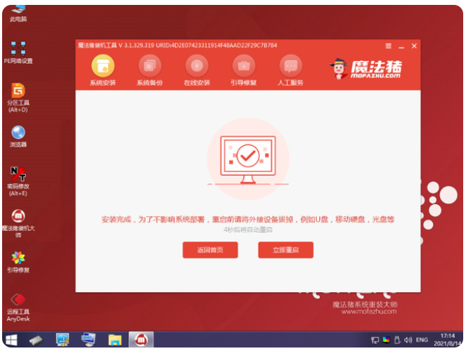 3、當提示部署環境完成后,直接選擇重啟電腦。