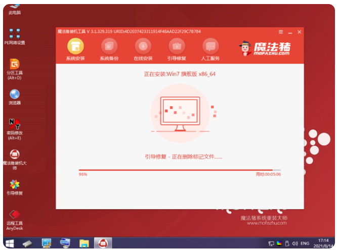 5、在pe系統界面,魔法豬裝機工具會自動打開并安裝win7系統。