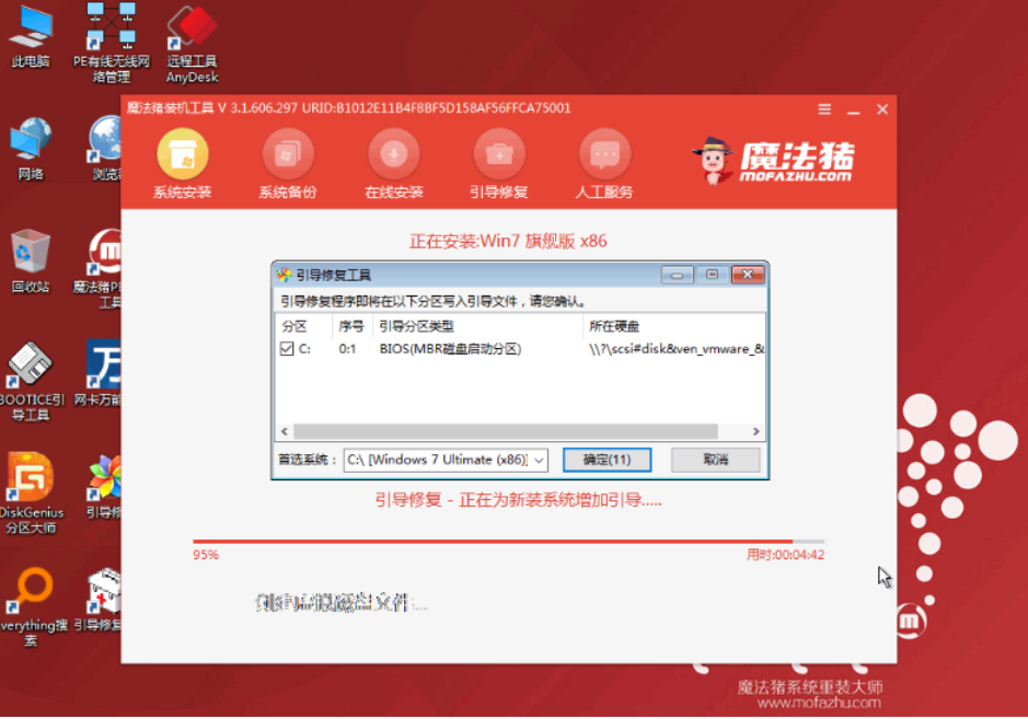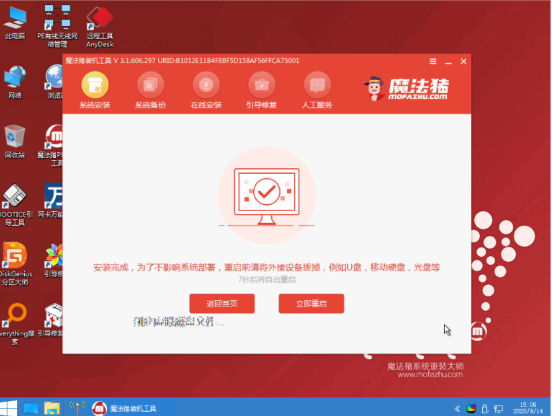 5、進入魔法豬 PE 系統,軟件就開始自動幫助我們安裝系統啦,我們只需要耐心等候安裝完成即可。