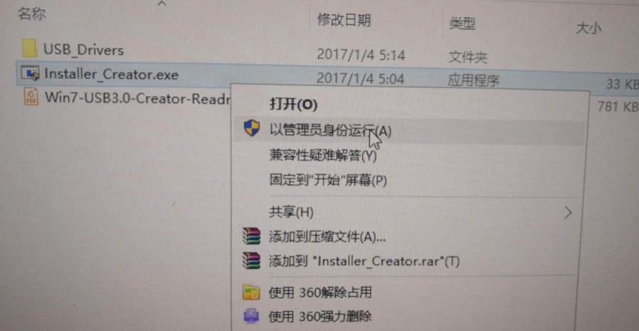解壓Win7-USB3.0-Creator-V3-Win7Admin.zip,右鍵以管理員身份運行Installer_Creator.exe。