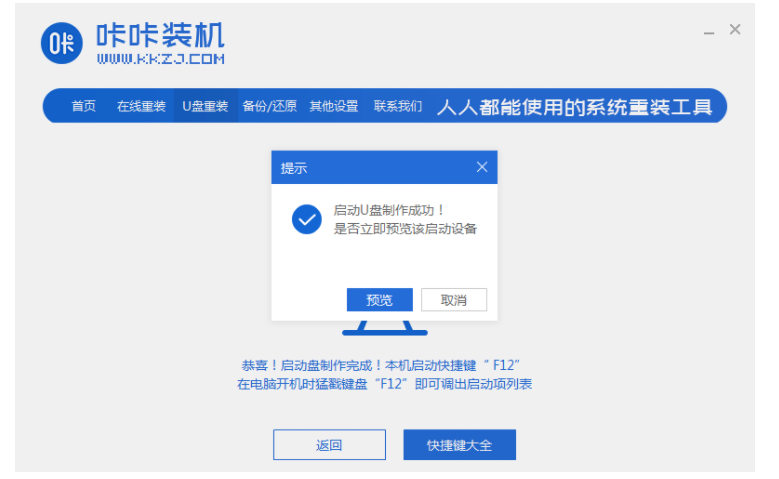 4、等待咔咔裝機提示“啟動u盤制作成功”后,我們可以先點擊“預覽”。