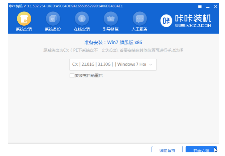 8、將目標分區改為“磁盤C”,點擊“開始安裝”。