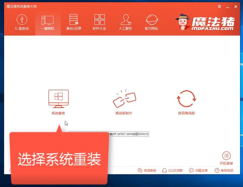 2、進入魔法豬系統重裝大師的主界面,選擇一鍵裝機界面下的系統重裝