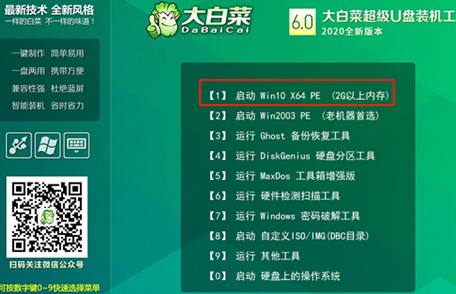 3、進入大白菜主菜單后,通過“↑↓”鍵選擇“【1】啟動Win10 X64PE(2G以上內存)”后回車確認。