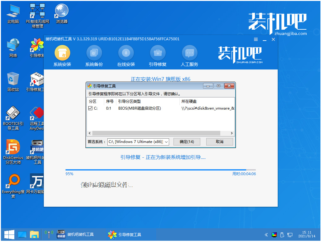 打開裝機吧一鍵重裝系統,選擇win7系統進行下載,等待系統重啟安裝。