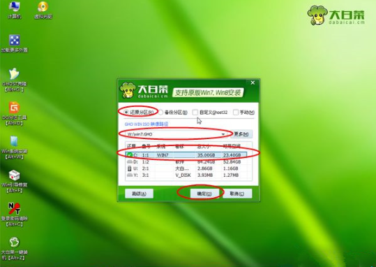 7、點擊上方的“還原分區”,選擇系統需要安裝的位置,一般是安裝在C盤,點擊確定;