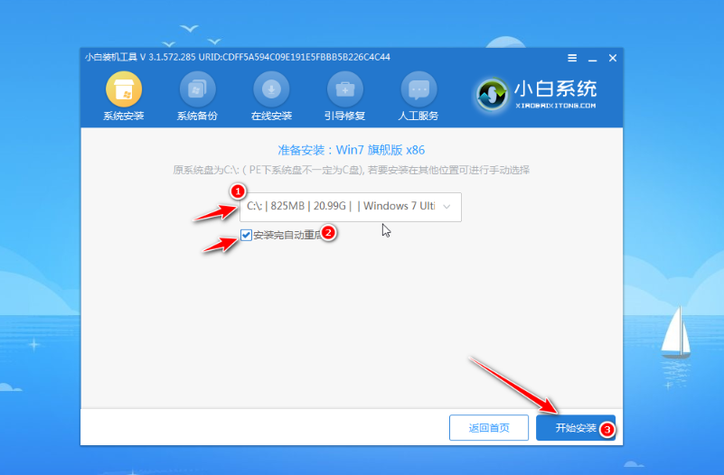 5、繼續打開桌面上的小白裝機工具,選擇win7系統點擊安裝。