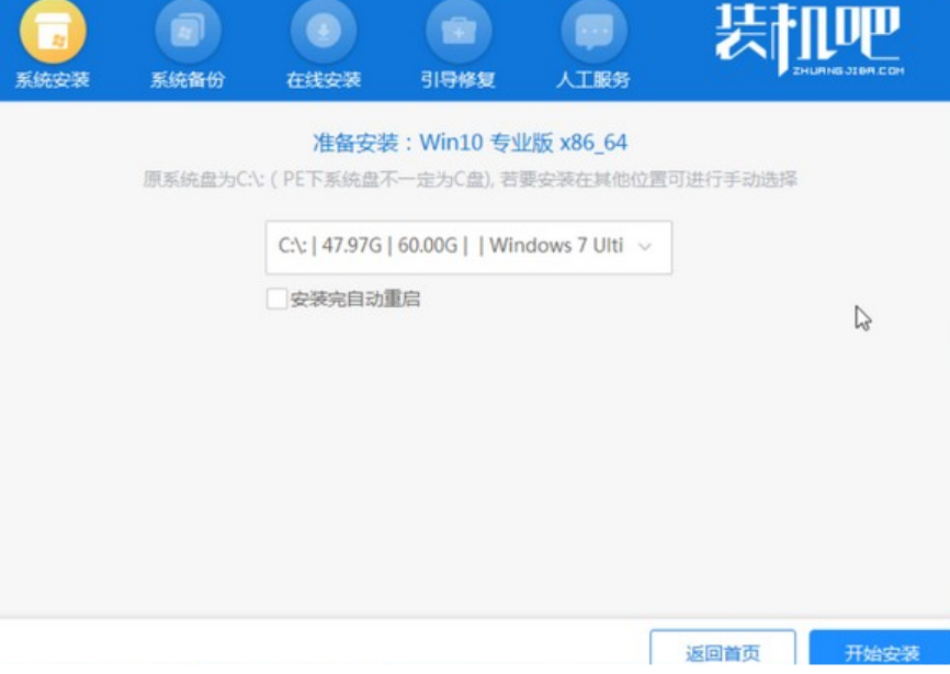1.瀏覽器搜索裝機吧在線系統重裝工具軟件并打開,選擇制作系統,點擊開始制作。