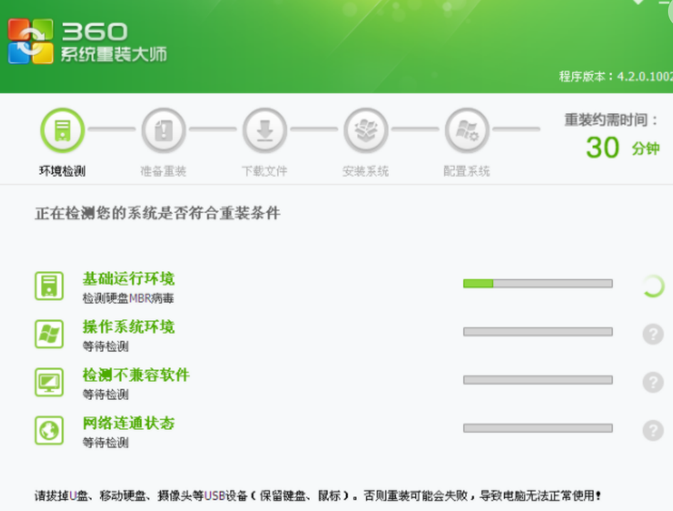 下載打開360一鍵重裝軟件;點擊“裝環境檢測”;提示備份好C盤所有數據;接著將自動檢測并在云端下載差異文件;