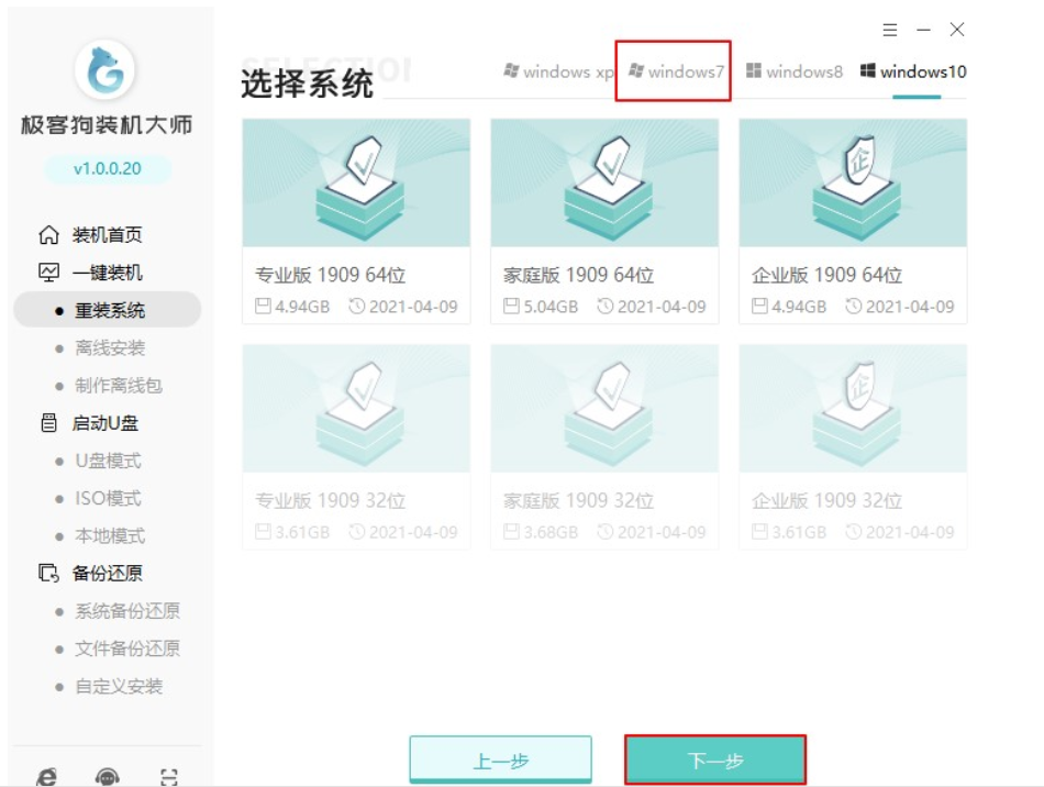 1、先在瀏覽器下載極客狗裝機大師軟件,然后關閉殺毒軟件,再打開軟件“立即重裝”。極客狗裝機大師會開始檢測電腦的信息,然后點擊“下一步”。