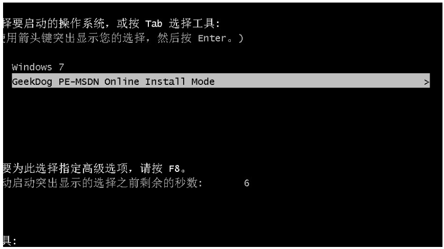 5、接下來極客狗下載系統文件,下載完成后會自動重啟,重啟選擇PE所在項回車。