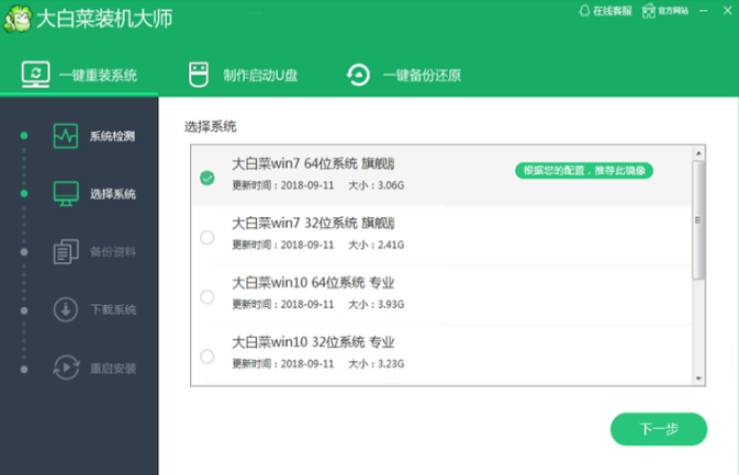 1、進入官網下載安裝大白菜裝機大師軟件到電腦上,雙擊打開,在系統檢測完成后點擊下一步。