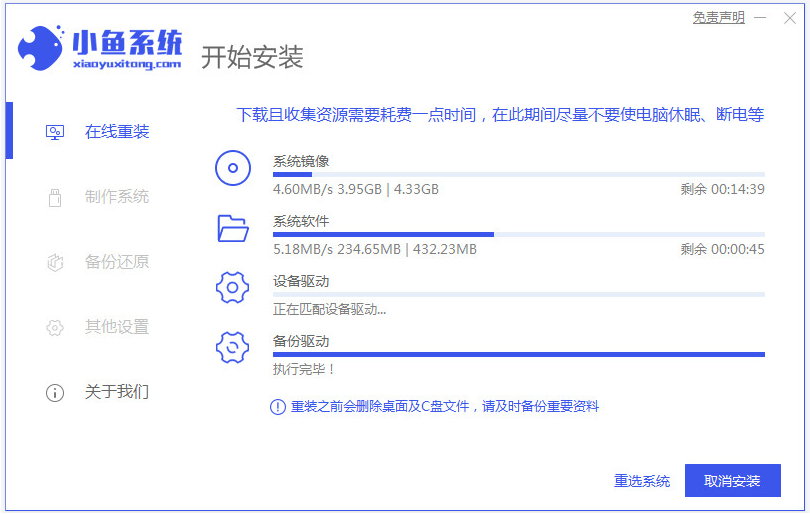 5、在pe系統內,小魚裝機軟件自動安裝win7系統。