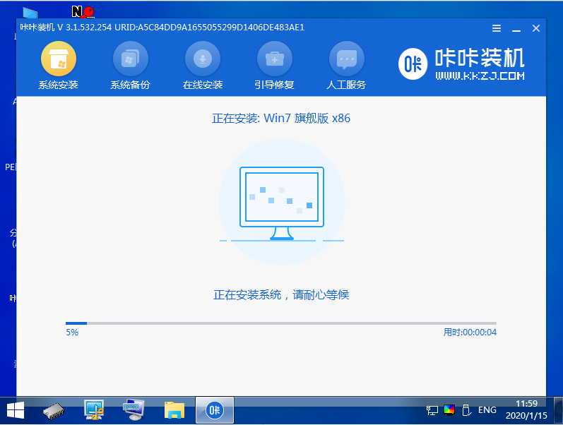5、在pe系統內,咔咔裝機工具自動打開安裝win7系統。