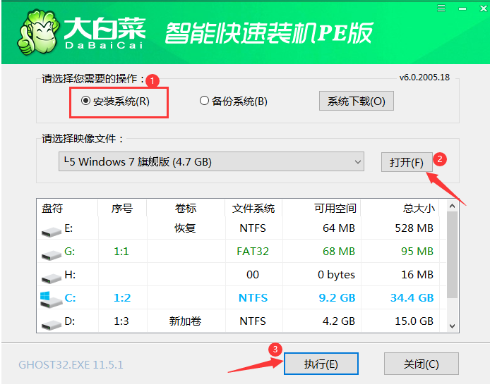 點擊【打開】就可選擇你想要安裝并已經下載好的win7系統,安裝路徑一般默認勾選為C盤,然后點擊【執行】即可。
