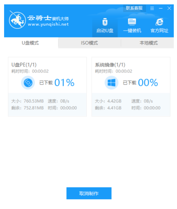 1、在官網上下載并安裝云騎士一鍵重裝系統軟件,雙擊運行軟件,進入主界面中選擇啟動U盤界面。接著在電腦上插入一個空白8g以上的u盤,點擊制作U盤啟動盤。
