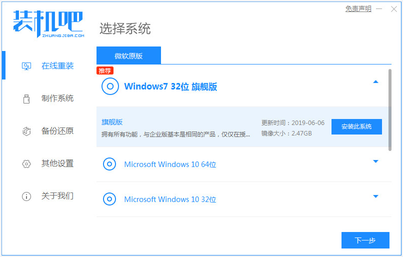 華碩電腦安裝裝機吧一鍵重裝系統工具,打開選擇win7系統安裝;
