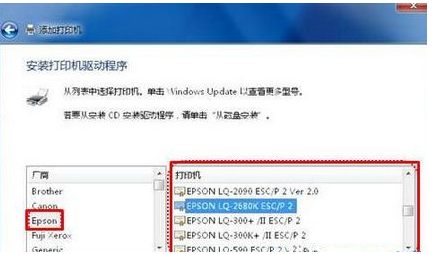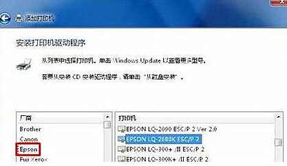 5、在左側廠商框中選擇對應的品牌(這里小編的是Epson),然后在右側選擇對應的打印機型號,點擊下一步即可;