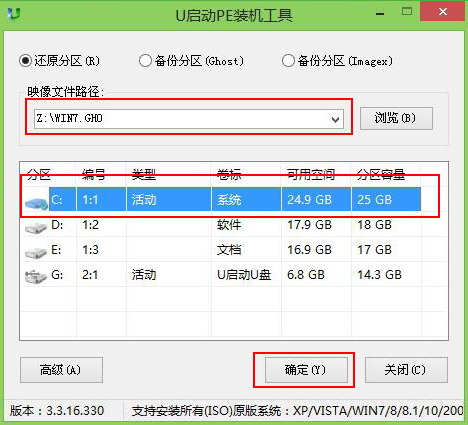 2、在pe系統內,pe裝機工具會自動開啟并識別u盤中的準備好的win7系統鏡像,選擇磁盤安裝分區,一般為C盤,點擊確定。
