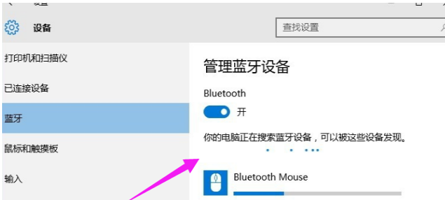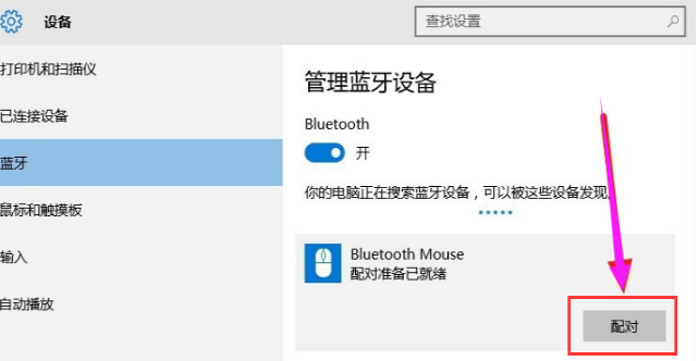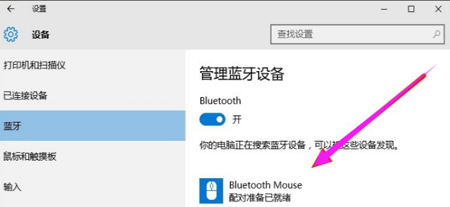 5、等待一會就會出現鼠標設備,表明已經搜索到鼠標。提示配對已就緒;